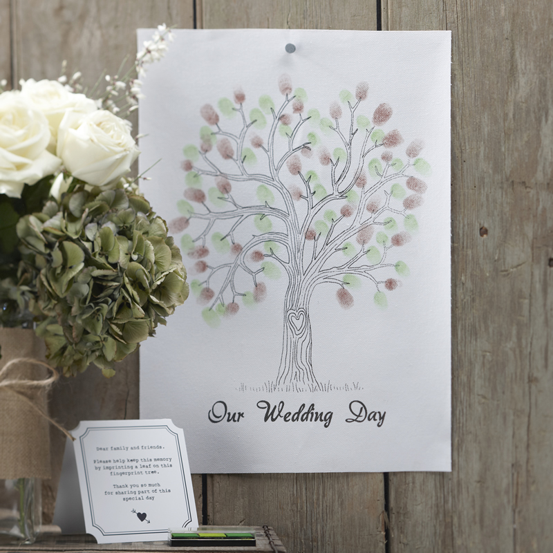 Ett verkligt speciellt sätt för gästerna att lämna spår efter sig på bröllopsfesten! Fingeravtrycken bildar löv på trädet som ni sedan kan rama in. En gästbok man verkligen njuter av i många år framåt!