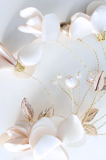 Exklusivt handgjort hårsmycke med tygblommor i ljusaste rosa, guldblad och sötvattenpärlor . Perfekt för dig som vill ha en riktigt chic hårdekoration i fantastisk kvalité!
