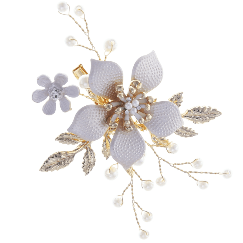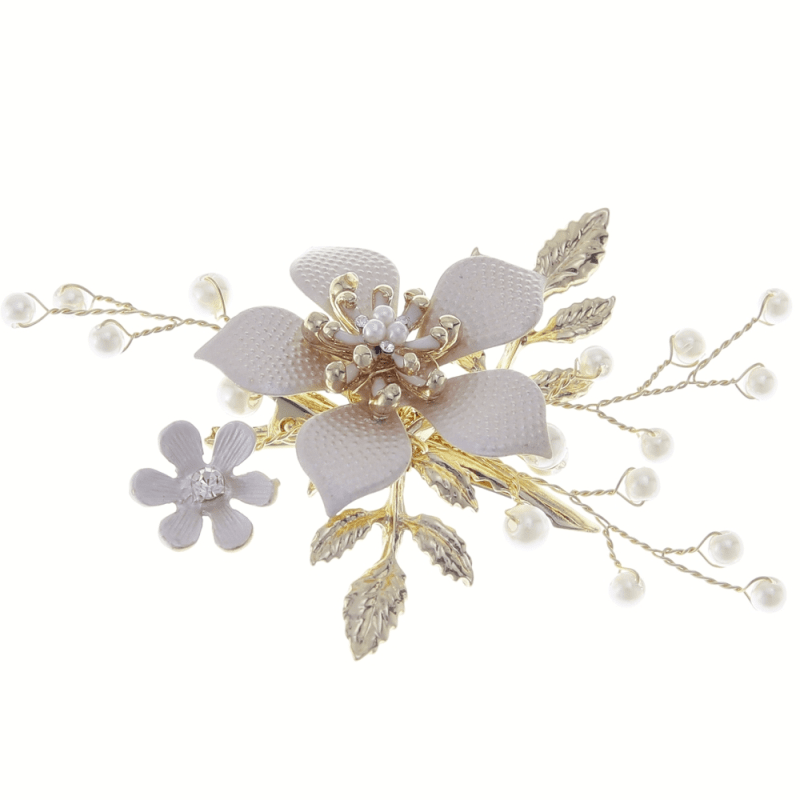 Sött hårsmycke i form av hårclips dekorerat med falska pärlor och blommor.