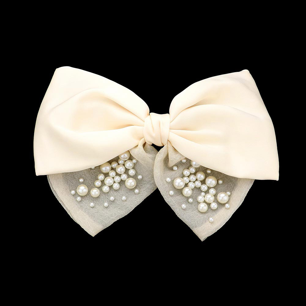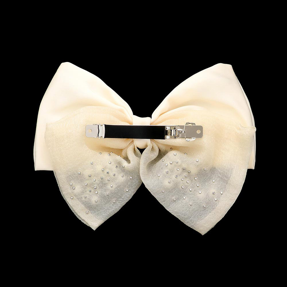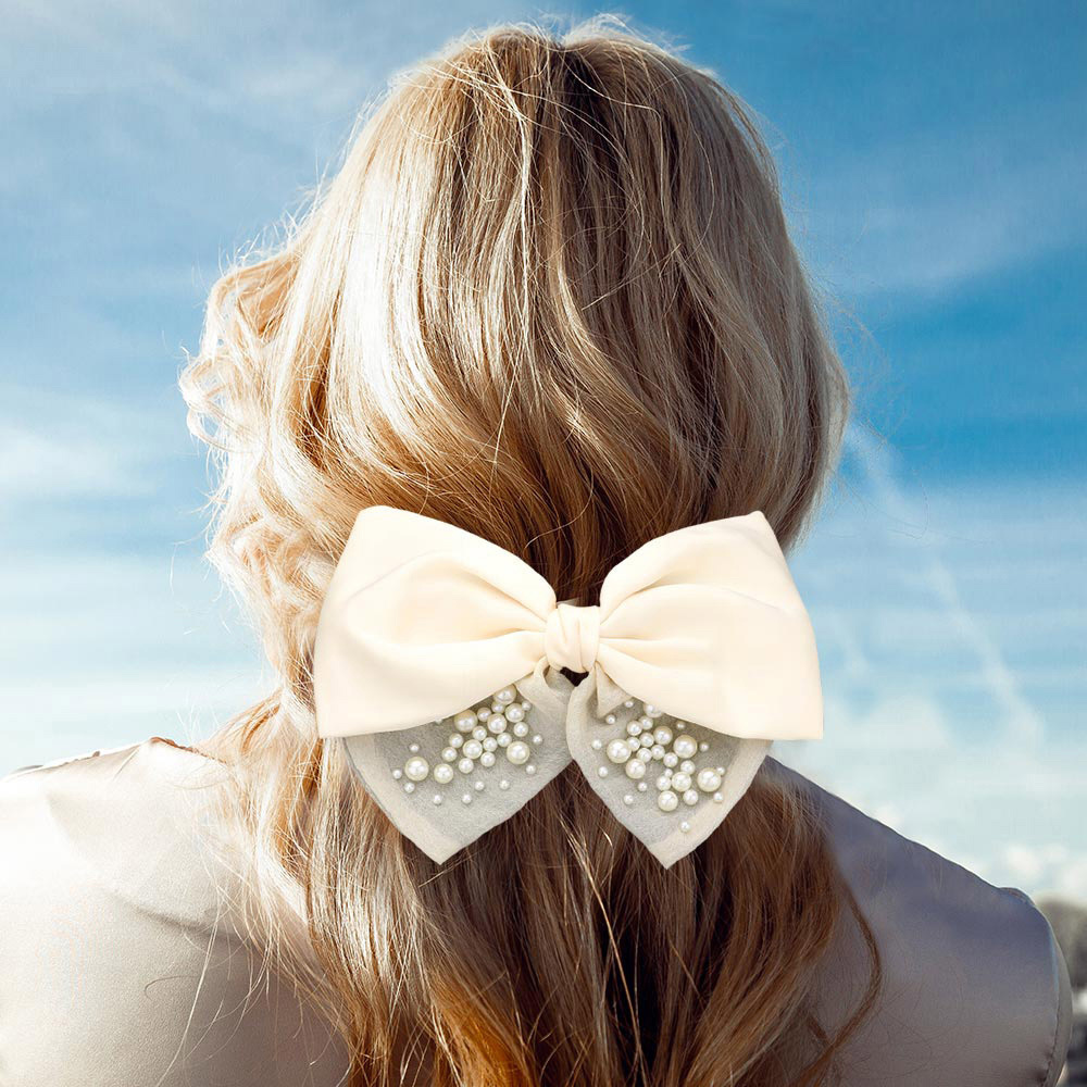 Underbart och klassiskt hårspänne med rosett i cremefärgat satintyg, dekorerat med falska pärlor.