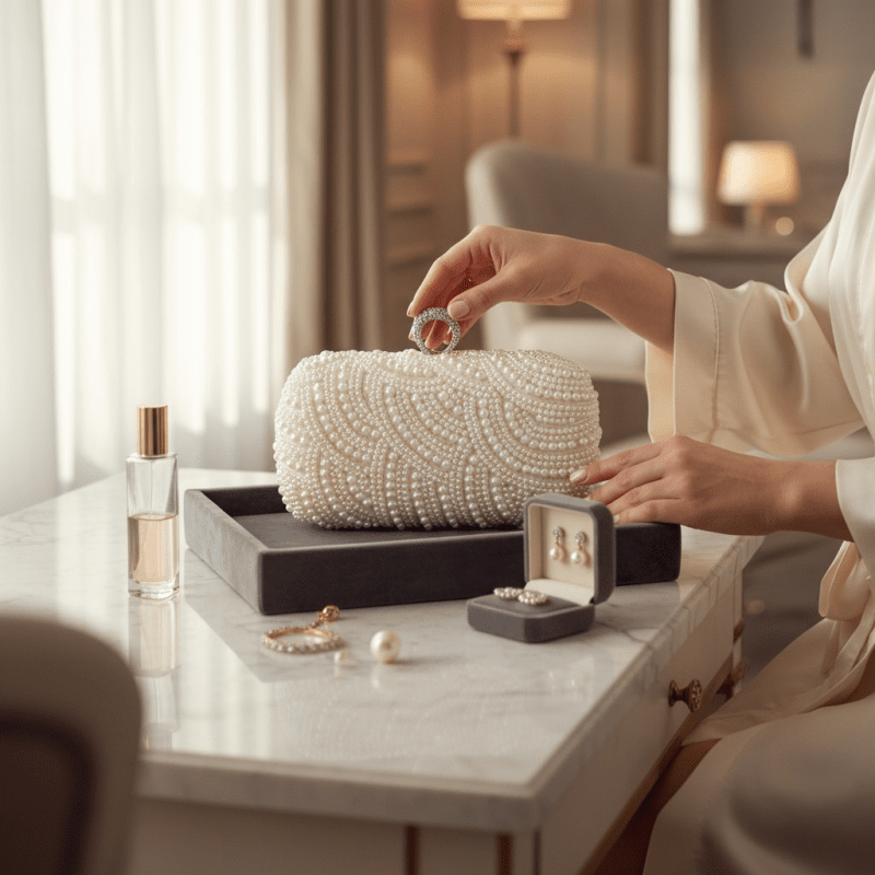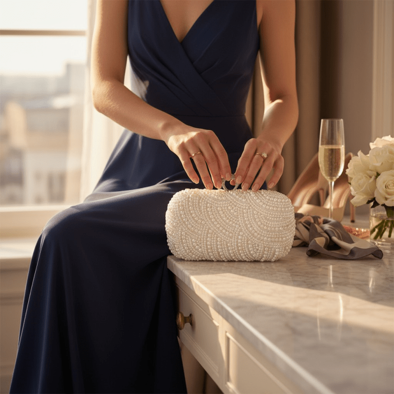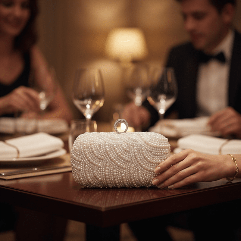 Underbart glamourös och lyxig aftonväska i satin med ena sidan helt pärlbroderad.